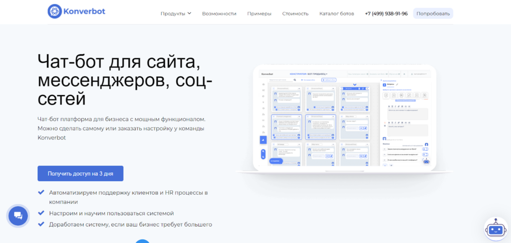 Konverbot – конструктор чат-ботов под разные задачи: для консультации клиентов, поддержки, найма сотрудников и т. д. Есть встроенная CRM и интеграции с Битрикс24 и другими системами, а также функционал для тестирования бота в интерфейсе конструктора и анализа производительности после запуска.
