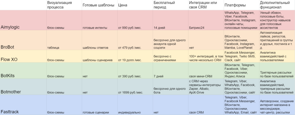 Чтобы вам было проще определиться с инструментом, который подойдет по бюджету и функционалу, мы собрали все конструкторы чат-ботов из этого обзора в таблицу и сравнили их по важным, на наш взгляд, критериям: