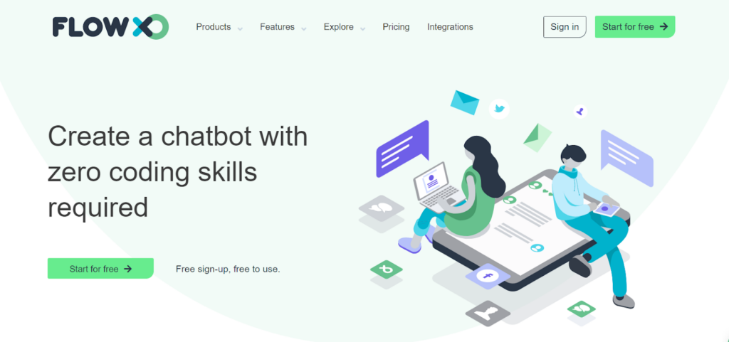 Flow XO – конструктор чат-ботов под разные бизнес-задачи: для приветствия посетителей сайта, сбора и квалификации лидов, ответов на частые вопросы и т. д. Работает в браузере и интегрируется с сотней других сервисов и приложений, включая Trello, Gmail, Zoho CRM, Basecamp 2, MailChimp и т. д.