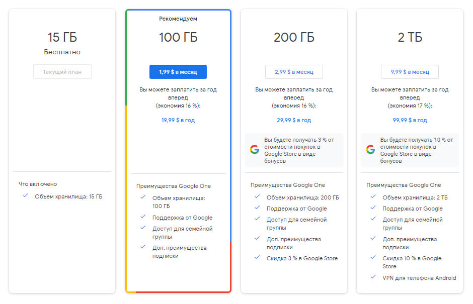 Размер хранилища: 15 ГБ, 100 ГБ, 200 ГБ и 2 ТБ.