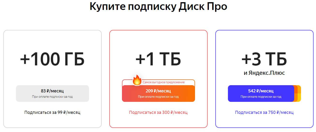 Размер хранилища: 2 ТБ, 3 ТБ, 5 ТБ, неограниченный объем на самом дорогом тарифе.