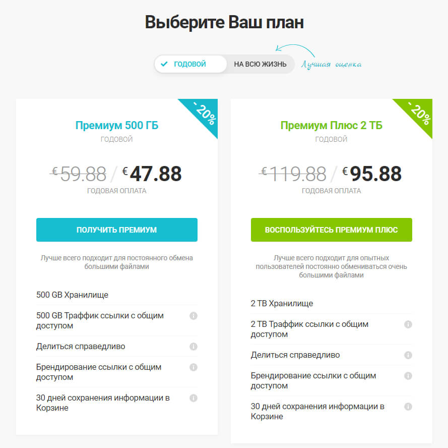 Стоимость: от 47,88 евро за год на 500 ГБ или 175 евро за 500 ГБ на всю жизнь.
