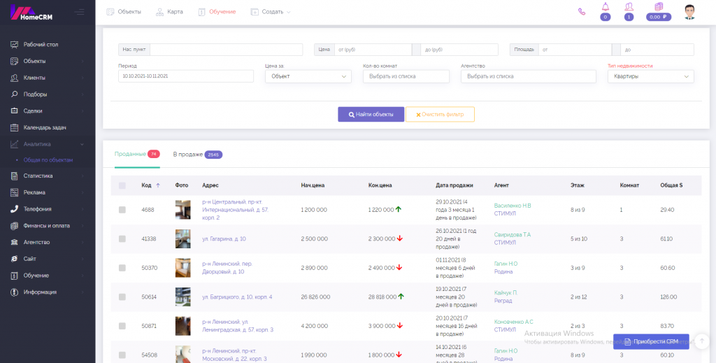 Большой раздел с данными по проданным и продающимся объектам. Отслеживайте движение цен, сроки выставления на продажу и ответственных агентов. Для быстрого поиска можно пользоваться фильтрами.
