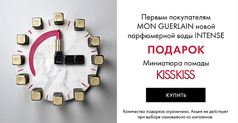 Трипваер зацепит поклонников бренда Guerlain. Они уже знают, какую парфюмированную воду хотят купить и ищут ее онлайн. Этот интернет-магазин мотивирует на покупку подарком — помадой KissKiss от Guerlain. При этом покупателю не нужно выполнять какие-то дополнительные условия акции — только регистрация и покупка этого парфюма.