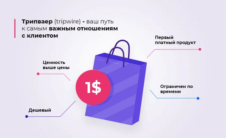 Tripwire в автоворонке — это продукт-«наживка», который вы предлагаете потенциальному клиенту после лид-магнита. Главное отличие этих двух продуктов — трипваер показывают пользователю только один раз и за него клиент отдает свои кровные.