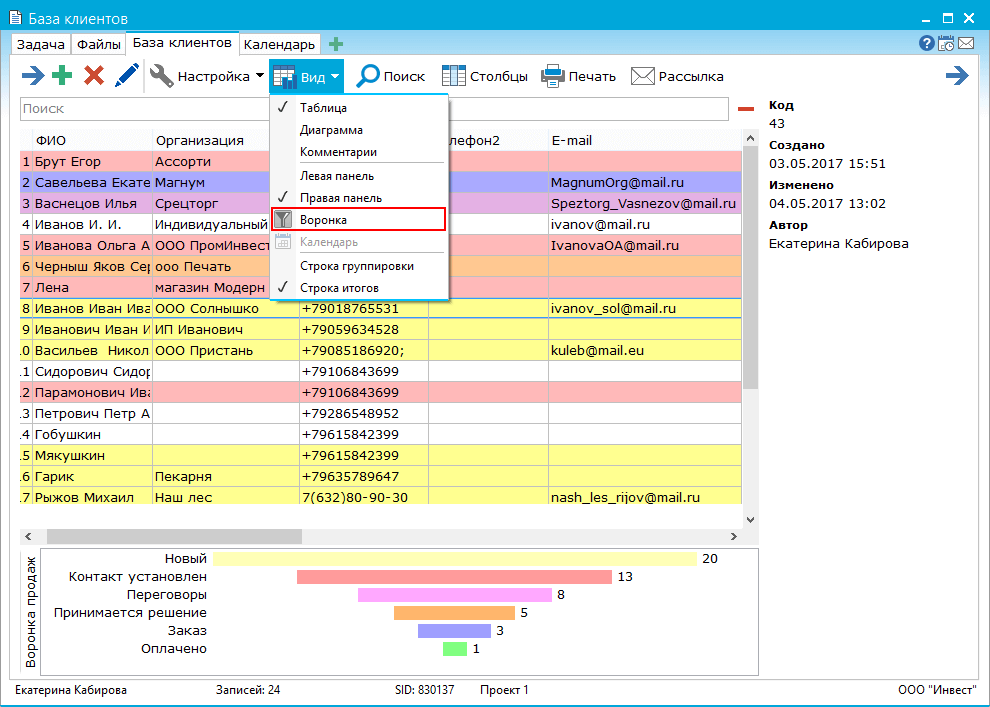 Воронка продаж отображается внизу окна таблицы (CRM) в виде гистограммы. Вы можете показать или скрыть воронку продаж, используя кнопку «Воронка» на панели инструментов.
