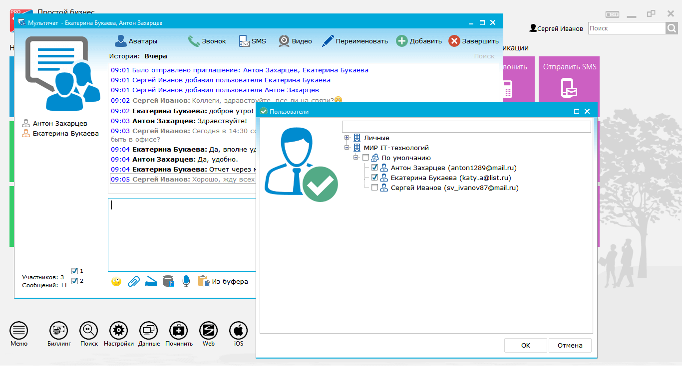 Кроме того, можно общаться с сотрудниками при помощи внутренних сообщений как один на один (чат), так и в группе (мультичат). Плюс доступен функционал для создания видеоконференций.