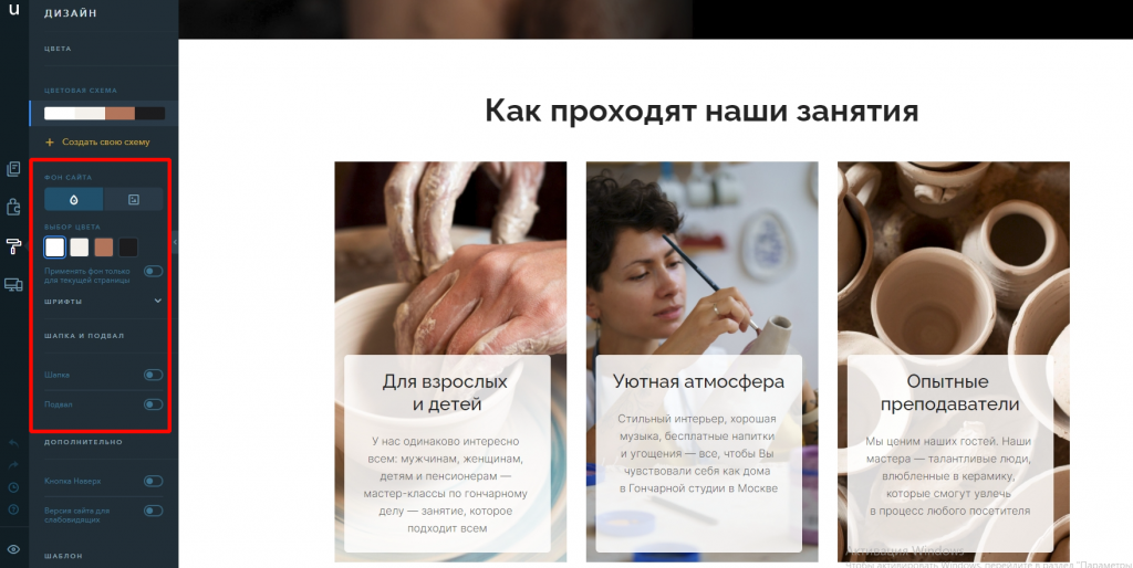 Также секции можно клонировать, менять местами, закреплять, скрывать для показа на выбранном типе устройств и т. д. Ещё можно выбрать цветовую схему сайта – все элементы перекрасятся, что довольно сильно влияет на восприятие макетов страниц.
