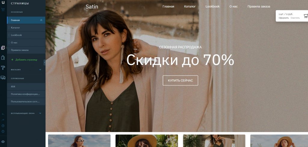 Интерфейс обладает понятной структурой: визуальный редактор, в котором Вы собираете сайт, а также четыре раздела – страницы, конструктор, дизайн и адаптивная версия сайта. В Страницах можно добавлять/удалять разделы сайта, ссылки на которые автоматически прописываются в главном меню. Если нужен блог, добавьте страницу формата Новости.