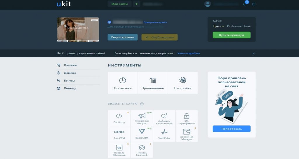 Этот сервис имеет полный комплект инструментов, необходимых для успешного запуска и привлечения потенциальных клиентов на сайт.