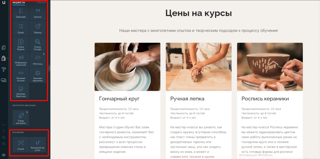 Два виджета стоят особняком – калькулятор услуг от uCalc и Ecwid, который является мощным магазинным плагином, альтернативой встроенному в Юкит решению.