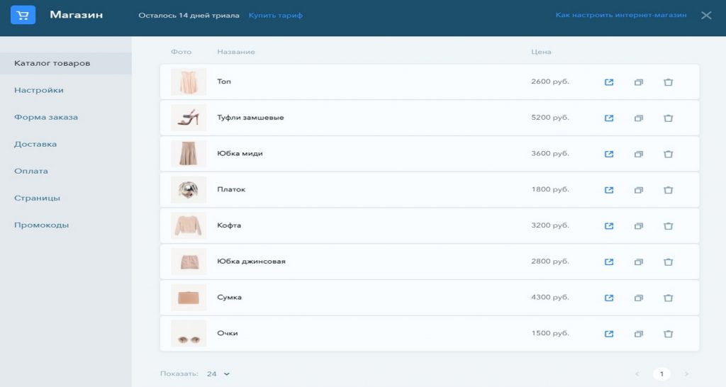 Все добавляемые товары попадают в каталог, в который можно перейти через настройки. Поддерживаются опции товаров, можно менять структуру их отображения на витрине. Открытие возможно отдельной страницей или в окне. Название, описание, цена, форма заказа, корзина, промокоды – всё как положено. Увы, массово добавлять товары из CSV-файлов нельзя, только поштучно. Поэтому работать с большим объёмом неудобно, хотя и возможно, если хватит терпения, 100-200 позиций – самое то.