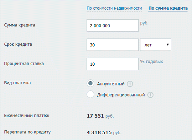 Во втором случае возьмем кредит 2 млн. руб.под 10 % годовых, но на 30 лет.