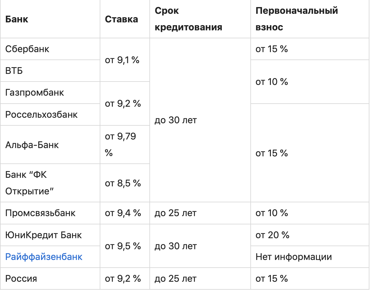 Как видите, условия по 10 крупнейшим игрокам на ипотечном рынке практически одинаковые. Поэтому надо анализировать дополнительные параметры.