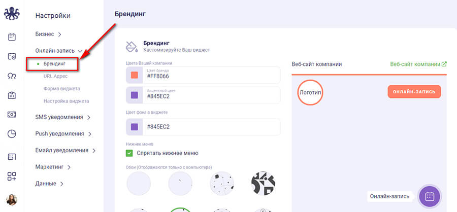 Виджет можно кастомизировать, чтобы он соответствовал корпоративному стилю компании. Заходим в «Настройки компании» — «Онлайн-запись» — «Брендинг». Здесь настраиваются основные цвета на сайте и в виджете, а именно: