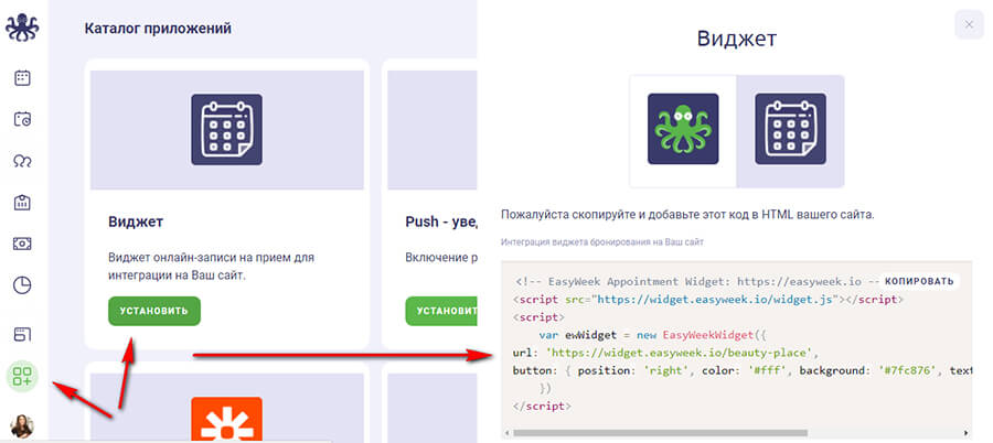 В личном кабинете EasyWeek нужно зайти в раздел «Интеграции», найти там виджет (первый в списке) и нажать на кнопку установить. Появится код виджета, который нужно скопировать.