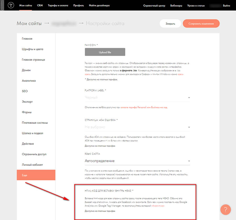 Нужно зайти в настройки сайта и открыть раздел «Еще». Спуститься до пункта «HTML-КОД ДЛЯ ВСТАВКИ ВНУТРЬ HEAD *» и нажать на редактирование.
