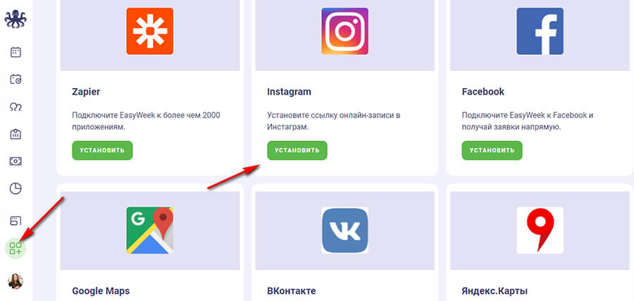 Заходим в раздел «Интеграции», находим нужную соцсеть, например, Инстаграм. Нажимаем «Установить».
