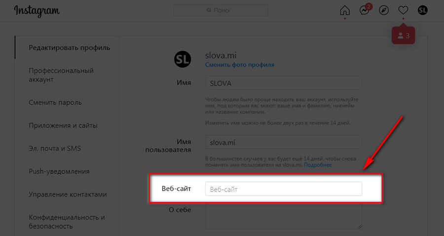 Копируем ссылку на страницу с виджетом и устанавливаем в профиле в соцсетях в поле «Веб-сайт» или «Ваш сайт» (зависит от соцсети). Вот, например, как это выглядит в Инстаграм.