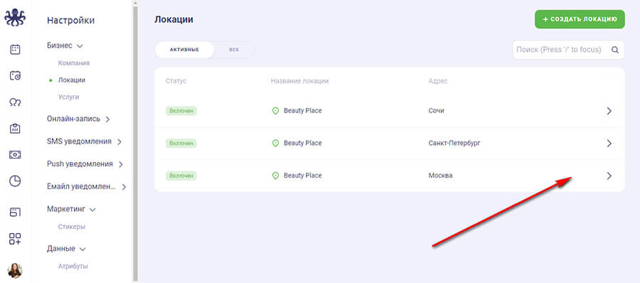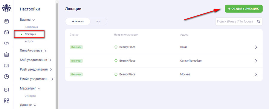 Во время онлайн записи, клиенту нужно знать точный адрес салона. Поэтому необходимо предварительно указать адрес заведения для виджета. Или нескольких заведений, если у вас сеть филиалов. Раздел «Локации» находится там же, в настройках компании.