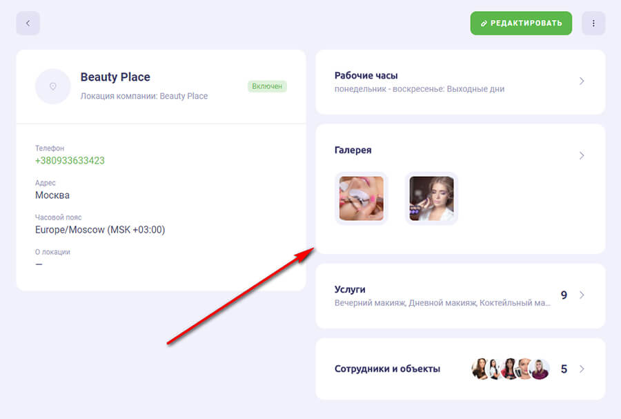 Так можно указать отдельно рабочие часы заведения, добавить фотографии в галерею, услуги и сотрудников филиала.