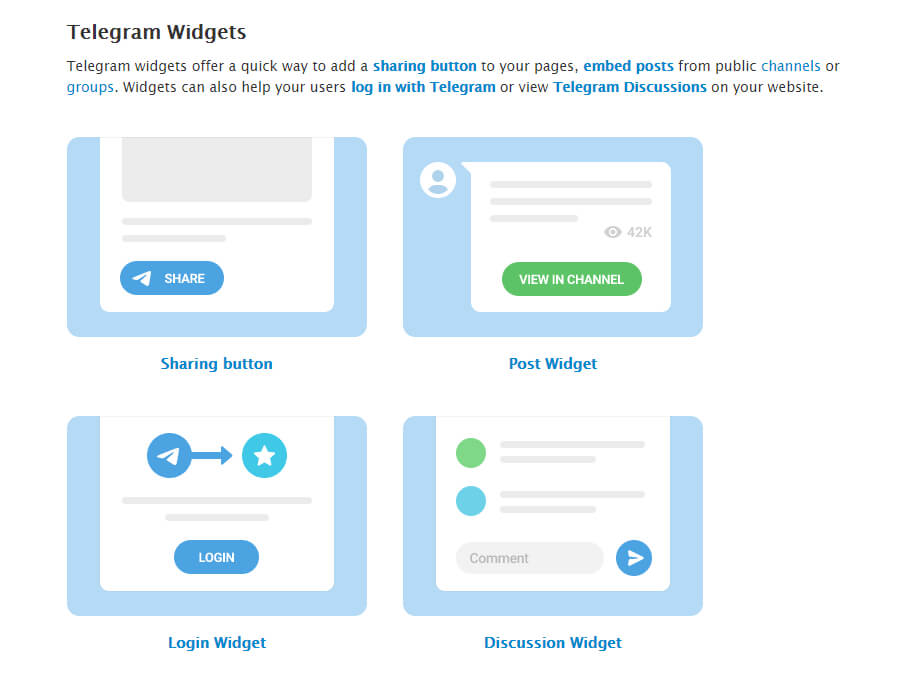 Также есть конструктор виджетов от самого Телеграма. В нем доступно 4 типа виджетов: кнопка «Поделиться в Телеграм», виджет поста (с возможностью перейти на канал), виджет, позволяющий авторизоваться через Телеграм и виджет для комментариев.