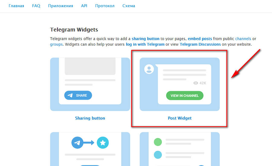 Заходим на страницу core.telegram.org/widgets. Выбираем тип виджета (один из четырех). В нашем случае это виджет поста, второй по счету. Кликаем на него.