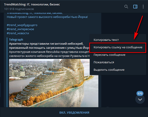 Чтобы просто получить код поста без внешних изменений, нужно найти нужное сообщение в Телеграм, нажать правой кнопкой мыши и скопировать ссылку на сообщение.
