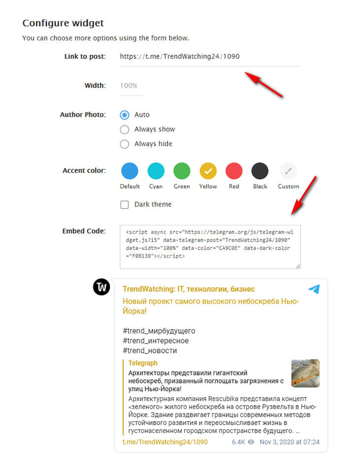 Создаем виджет поста (с кнопкой подписки) через конструктор Телеграма: