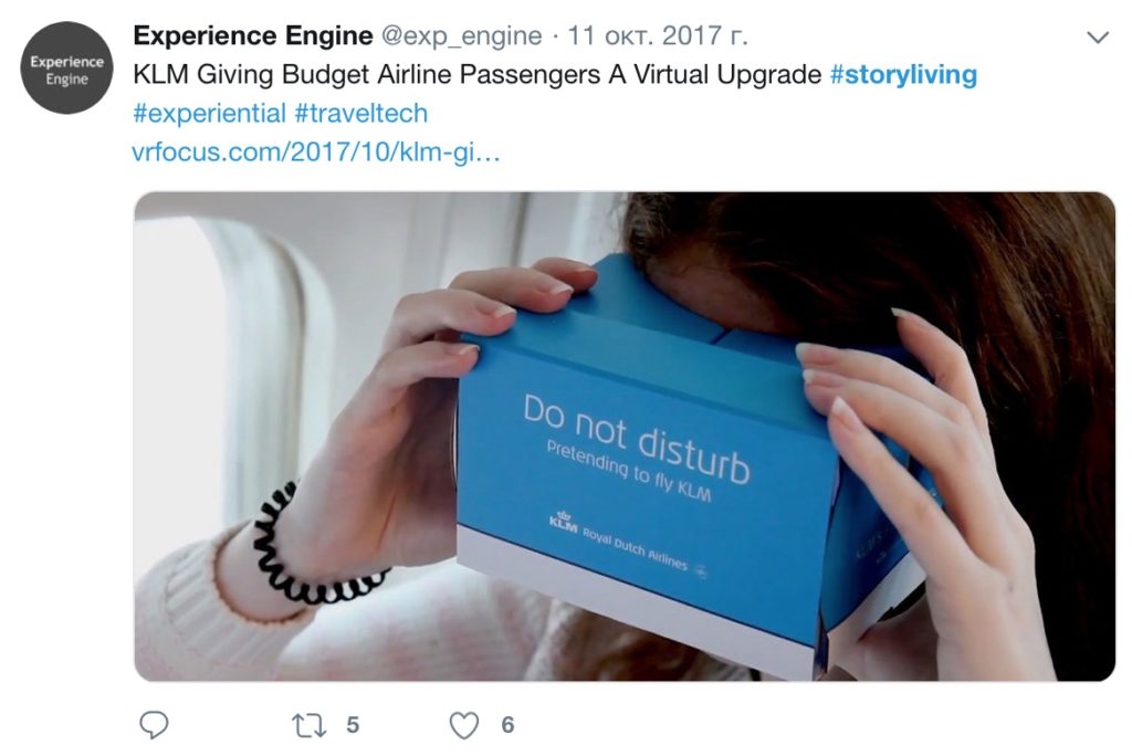 Забавное решение разработала нидерландская авиакомпания KLM, дав пассажирам бюджетных рейсов возможность виртуально «пересесть» на борт самолета бренда. Неудобное кресло, отсутствие развлечений и еды компенсировались комфортом KLM в виртуальной реальности, для которой компания изготовила фирменные очки. Нагляднее почувствовать преимущества перелета, которого не совершал, пожалуй, невозможно.