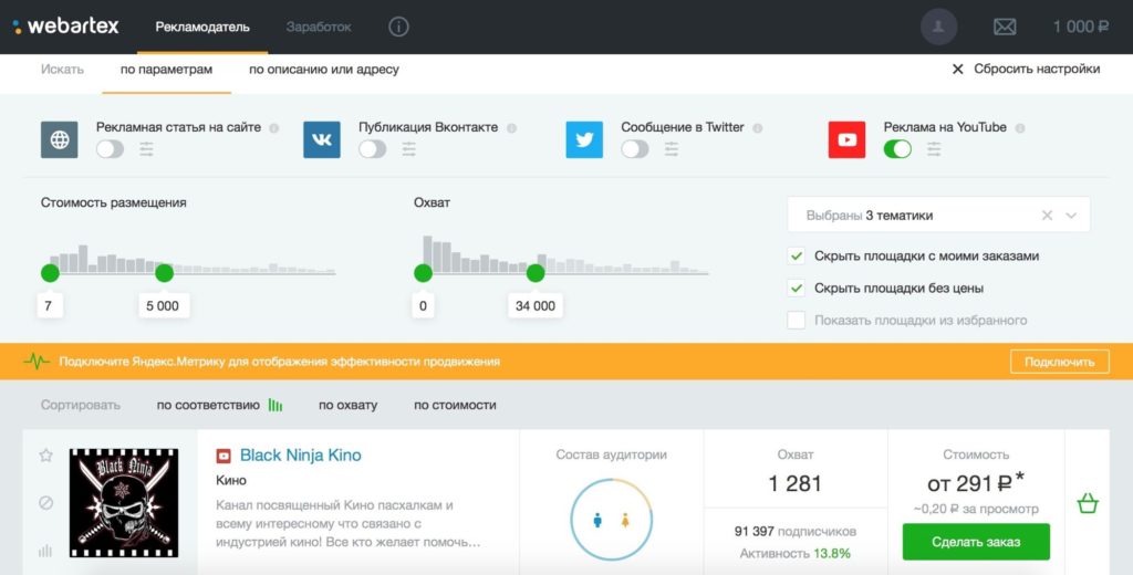 Простейший способ найти локальных лидеров мнений и начать с ними работать – это бесплатная платформа Webartex. Обширную базу блогеров на разных площадках можно фильтровать по тематике, охвату, цене сотрудничества, опыту и вовлеченности.