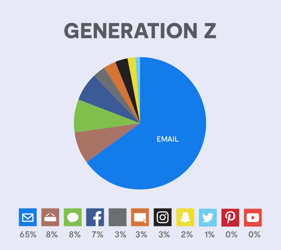 Парадоксально, но самый популярный канал взаимодействия молодежи с брендами – не соцсети, а email. Так утверждает 65% представителей поколения Z, в то время как на Facebook* и Instagram* в сумме приходится 10%, а на YouTube – 0%.