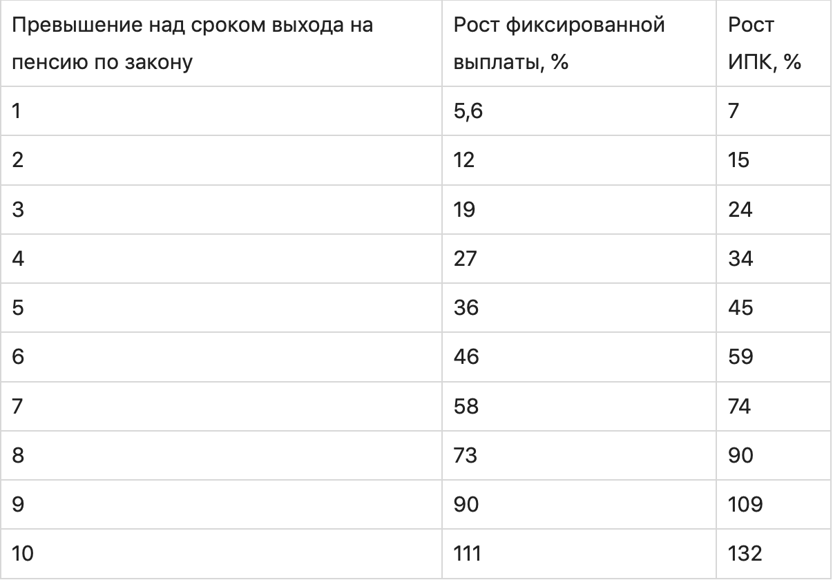 Чем позднее вы обратитесь за пенсией, тем выше будет фиксированная выплата и ИПК. Например, если вы заявите о своем праве на пенсионные выплаты через 4 года, то фиксированная часть вырастет на 27 %, а ИПК на 34 %. Если позже на 10 лет, то фиксированная часть увеличится в 2,11 раза, а ИПК – в 2,32 раза.