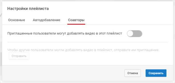 Последняя вкладка позволяет делать общие плейлисты, в которые приглашённые пользователи смогут добавлять свои видео.