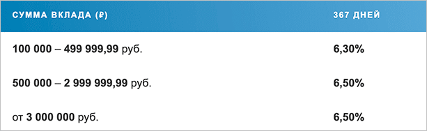 Минимум 100 тыс. руб. на 1 год. Базовая ставка от 6,3 до 6,5 % с ежемесячной выплатой процентов. Остальные условия совпадают с предыдущими видами вкладов.