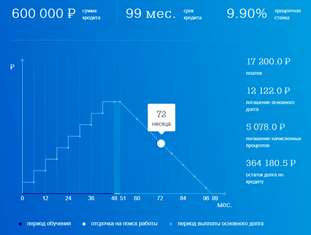 За период обучения в банк перечисляются только проценты. Основная сумма долга погашается уже после окончания вуза. На графике видно, как работает кредит на образование. При четырехлетнем обучении 48 месяцев оплачиваются проценты, потом 3 месяца дается на поиск работы. Через 51 месяц погашаются и сумма долга, и проценты уменьшающимися платежами.