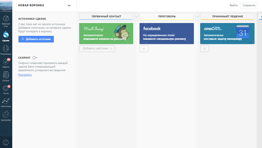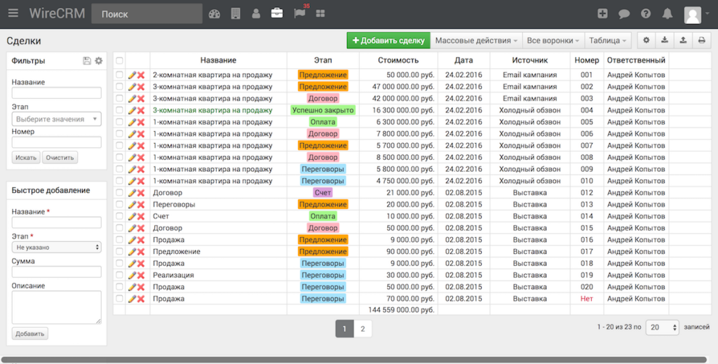 - Автоматический учет продаж. Сортировка сделок по этапу, типу, ответственному. Мультиворонки.