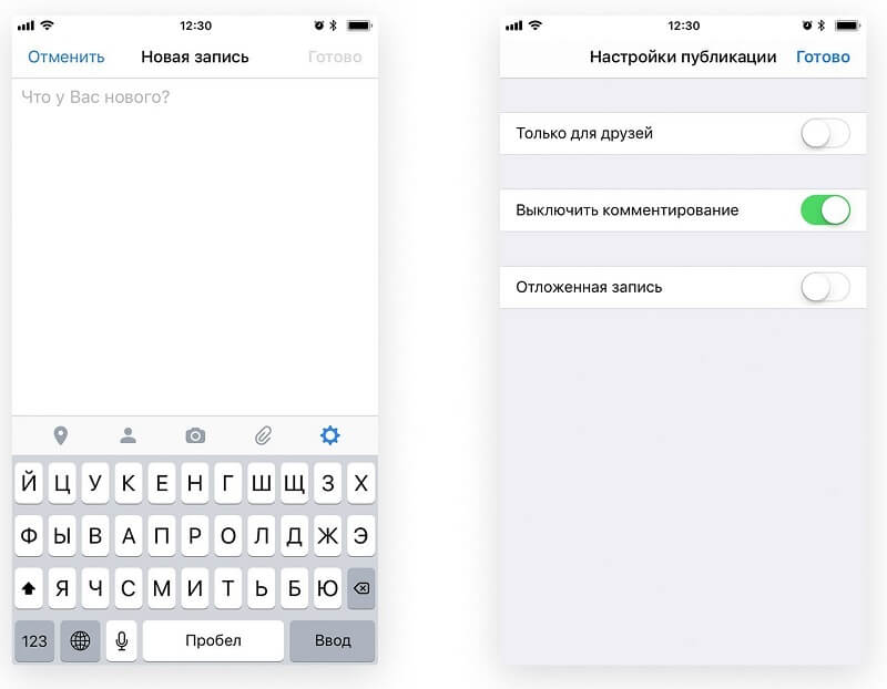 При создании новой записи тапаем на иконку с шестерёнкой и выберите переключатель «Выключить комментарии».