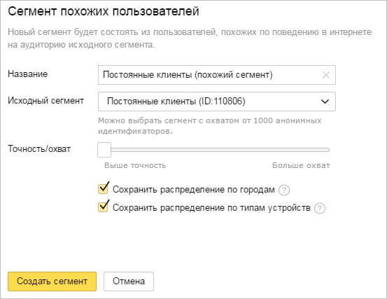 Что означаю галочки, проставленные напротив пунктов сохранить распределение по городам и типам устройств, спросите вы. Но здесь также всё просто, это значит, что если большинство пользователей в исходной аудитории из Москвы и осуществляется поиск с мобильных устройств, то система будет подбирать именно такую аудиторию.