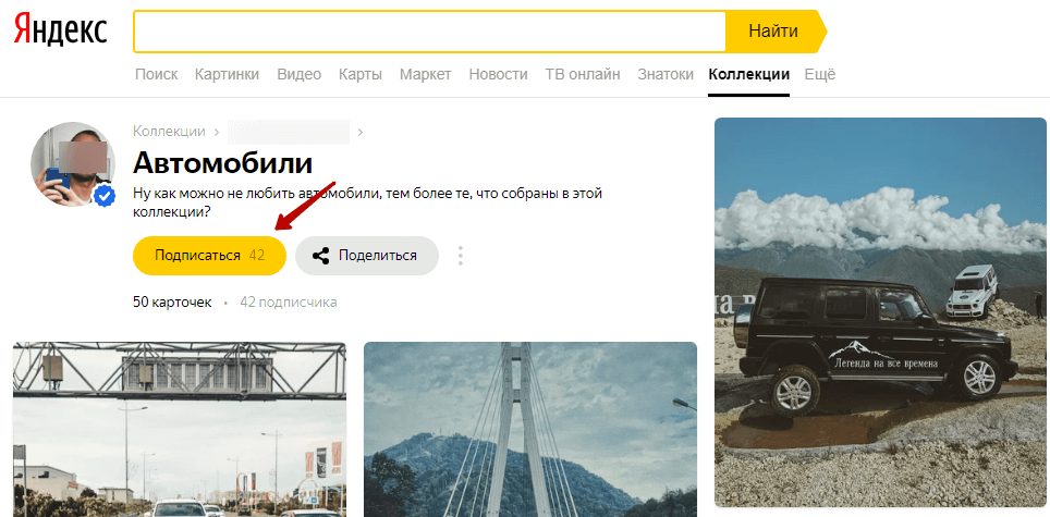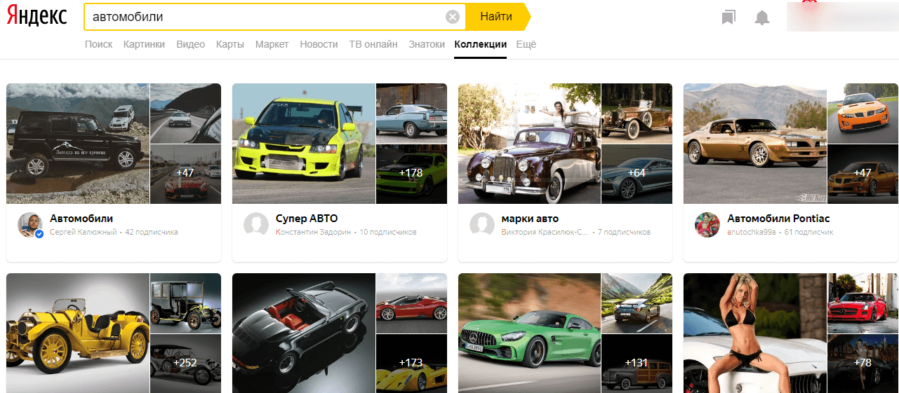 Внутри сервиса работает поиск. То есть, в любой момент можно зайти и поискать коллекции по конкретной теме. Например, вот что показали мне Коллекции в ответ на запрос «Автомобили»: