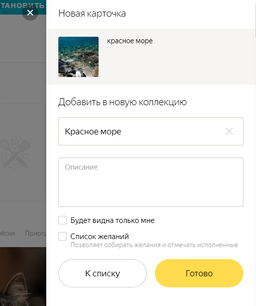 С расширением создавать коллекции еще проще – достаточно нажать на значок Яндекс.Коллекции, находясь на странице с понравившимся изображением. Затем выбираем изображение, пишем описание и добавляем в нужную коллекцию.