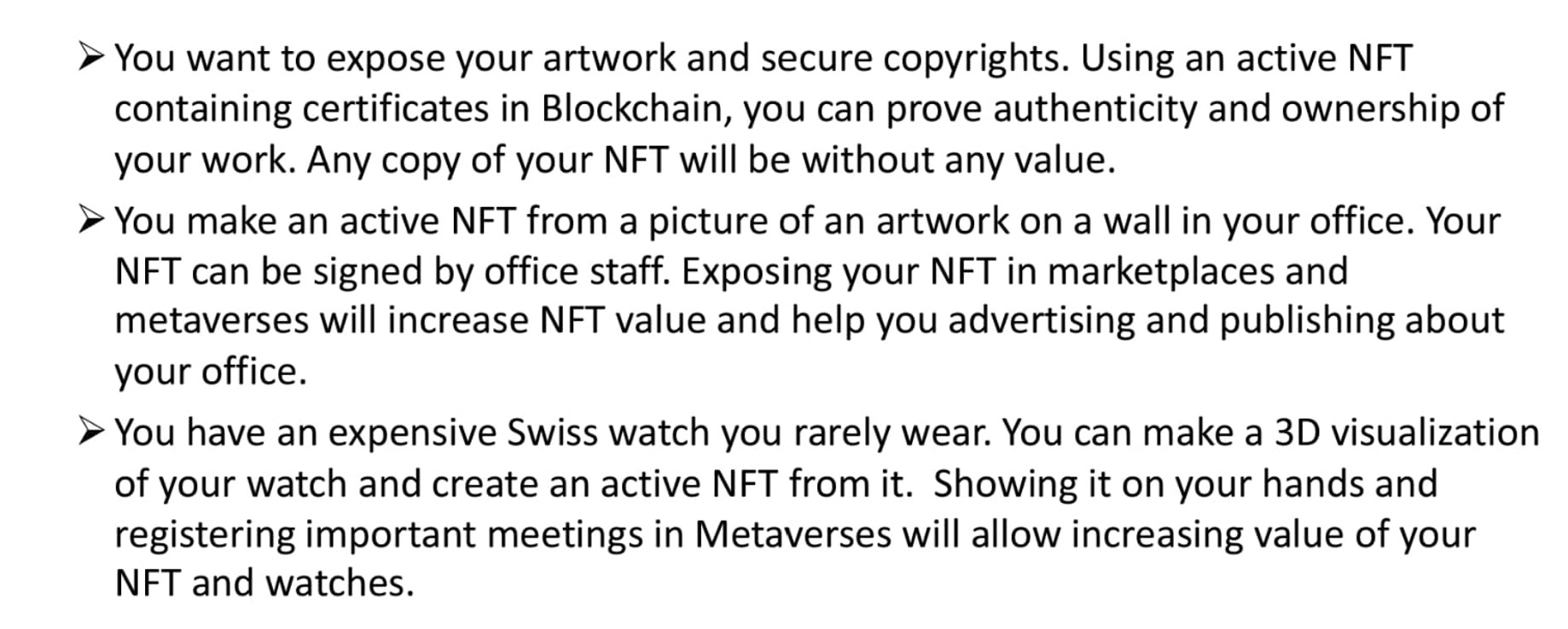 - Active NFTs are a way to protect copyright. NFT is easy to copy, but NFT + its life cycle certified by the Certificate in the blockchain is impossible to copy!